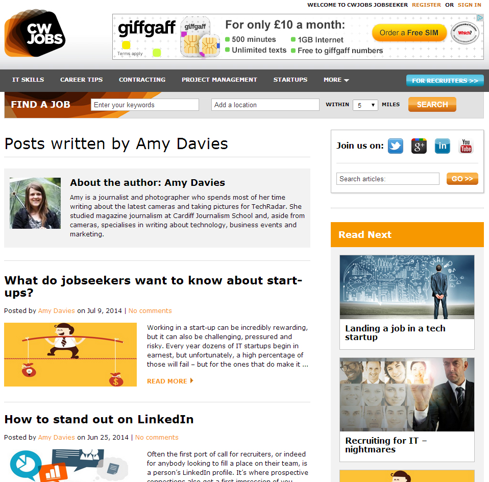 CW Jobs focuses on careers in IT, so, choosing from a set list of topics, I created 500-900 word pieces for the blog, on topics such as “How to stand out on LinkedIn”, “What do jobseekers want to know about start ups?” and “Ten Signs You’re A Bad Project Manager”.
